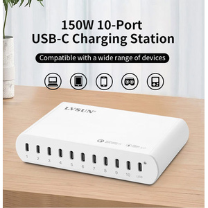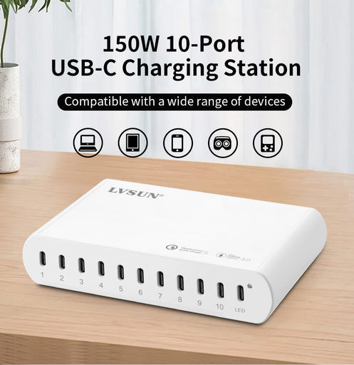 The 150W 10-Port USB-C Charging Station is designed for fast, efficient, and intelligent multi-device charging. It supports QC 5.0 and USB PD 3.0, delivering up to 20V at 5A per port, with a total combined output of 150W, making it ideal for smartphones, tablets, laptops, and other USB-C devices.