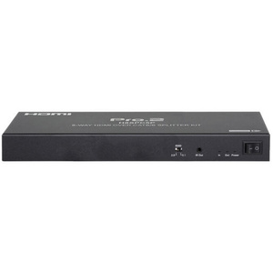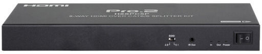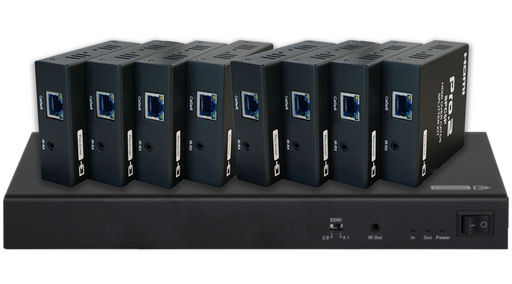 The 1x8 HDMI Splitter Extender kit includes one transmitter and four receivers, enabling a single HDMI source to be distributed to four displays with resolutions up to 1080p. HDMI signals can be extended up to 50 m at 1080p over a single CAT6 cable. The transmitter features a built-in HDMI loop output for local monitoring. The system also supports one-way IR pass-through, one-way PoC, advanced audio support with EDID control. It supports cascading up to 4 transmitter layers, enabling connection of up to 32 receivers for larger distribution setups.