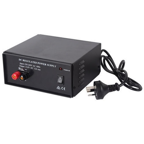 This is a high powered 13.8V switch mode power supply delivering up to 12A. Suitable for use in test and development environments. It has 4mm Banana style binding post output, fused input, LED power indicator, and internal cooling fan to assist cooling at higher temperatures.