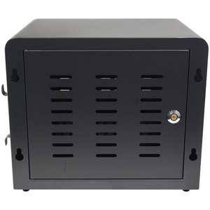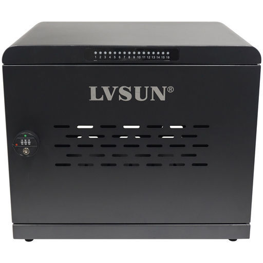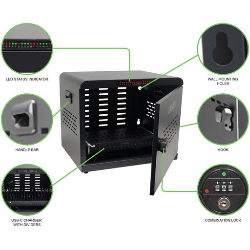The 1000W 16-Port USB-C Charging Cabinet provides secure device storage and high-capacity, simultaneous charging for multiple USB-C devices. The large, ventilated enclosure includes a front combination lock for secure access, air vents on all sides for proper airflow, handlebars for easy transport, a side cable-management hook, a built-in LED charging indicator, and rear wall-mount holes for flexible installation.