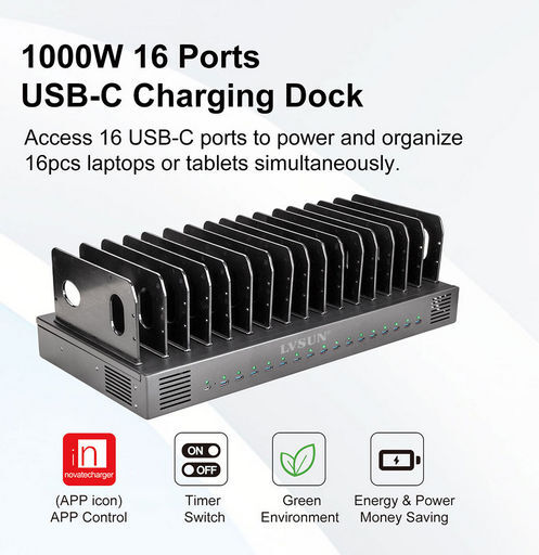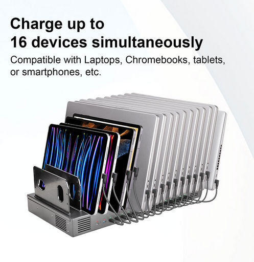The 1000W 16-Port USB-C Charging Station is a high-capacity powerhouse engineered for the most demanding multi-device environments. With support for QC 5.0 and USB PD 3.0, each port delivers up to 20V at 5A, with a total combined output of 1000W. This allows for the simultaneous fast-charging of up to 10 MacBooks at 100W, or a full fleet of Chromebooks, tablets, and smartphones, ensuring universal compatibility across virtually all USB-C hardware.