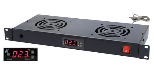 The 1RU standard 19" fan tray with mounting brackets. With 2x 120mm high speed cooling fans. With illuminated on/off switch and digital temperature controller conveniently located at the front and a C14 power socket and temperature sensor at the rear. Includes a 1m mains to C13 power cable. Dimensions 480x180x45mm