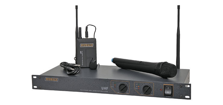 2 channel fixed frequency UHF wireless microphone systems, including handheld microphone and belt pack microphone. Ideal for systems requiring the freedom of two independent wireless microphones at an economical price. The sturdy 19” rack mount cabinet is fitted with two fixed frequency wireless receivers. The miniaturised SMD construction and unique shielding technique, plus individual squelch control, ensures excellent performance and minimal external interference. Each receiver features an independent front panel level control, AF, RF and peak indicators. Outputs are provided for each channel via 3 pin XLR, plus a mixed output via 6.35mm jack. The aerials are removable for remote mounting if required. Includes receiver, one handheld microphone and a lavalier belt pack (lapel mic included). A range of 50m or more is obtainable in ideal conditions. The perfect system for wedding ceremonies, DJs, sporting clubs, schools, restaurants and function centres.
