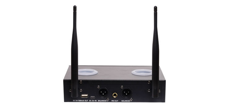 - Special features: Top mount charging ports for microphones Anti-feedback function