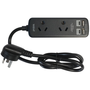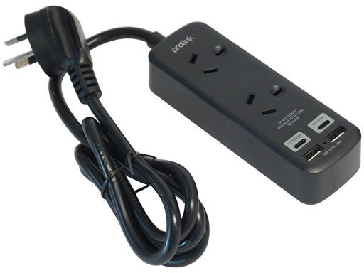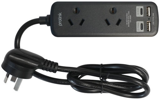 The Prolink PB2-4USB-BK is a surge-protected 2-way powerboard that features two USB-A ports, and two USB-C charging ports. It includes a 1-metre power cord fitted with a right-angled AC plug.