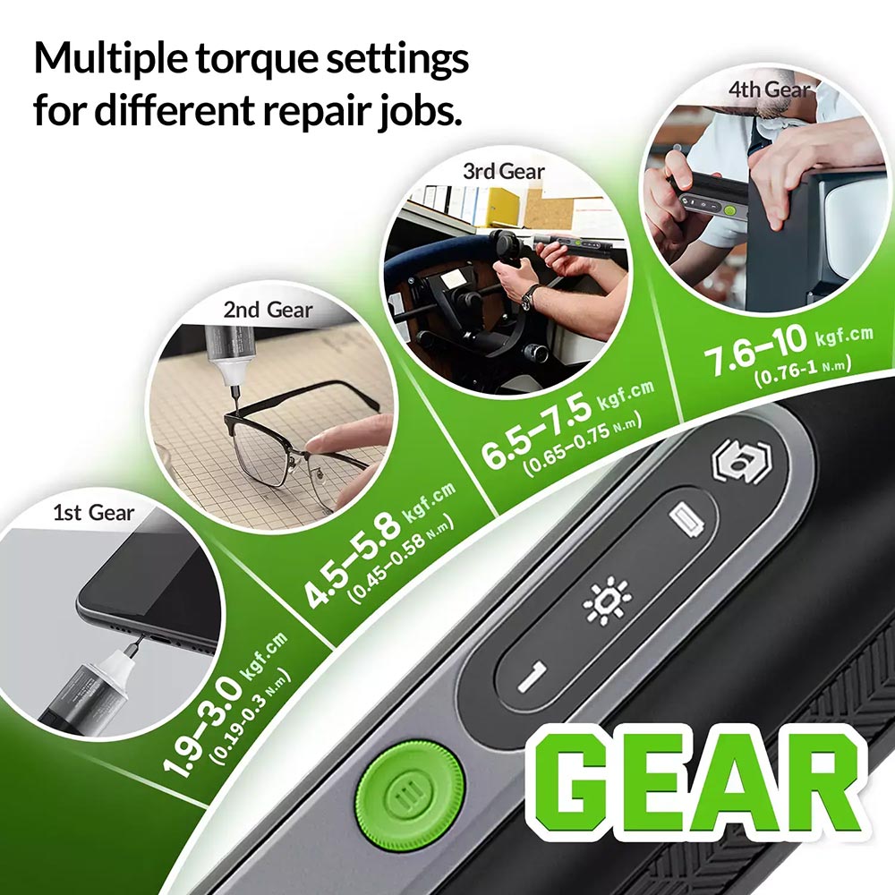 - 1st Gear: Torque 1.9-3.0 kgf.cm (0.19-0.30 n.m) | Speed 130-135 RPM (Suggested use: mobile phone motherboard, electronic watches, precision equipment)