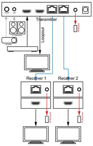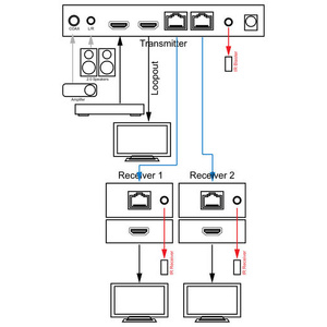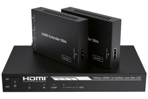 The 18Gbps HDMI 1x2 Splitter Extender kit includes one transmitter and two receivers, enabling a single HDMI source to be distributed to two displays with resolutions up to 4K@60Hz (4:4:4). HDMI signals can be extended up to 35 m at 4K@60Hz or 50 m at 4K@30Hz over a single CAT6 cable. The transmitter features a built-in HDMI loop output for local monitoring. The system also supports one-way IR pass-through, one-way PoC, audio extraction, and advanced EDID management for enhanced compatibility and installation flexibility.