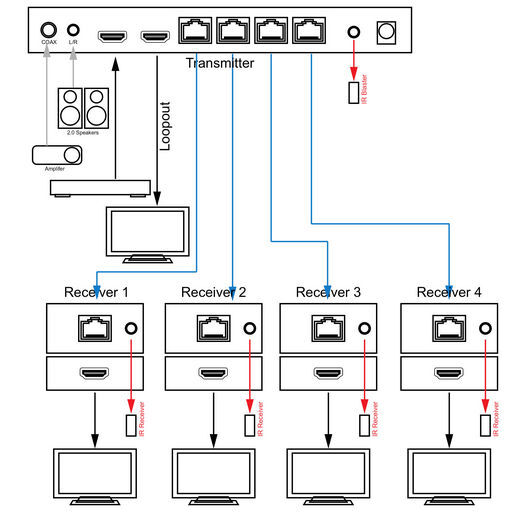 - Includes one HDMI transmitter and 4 receivers.