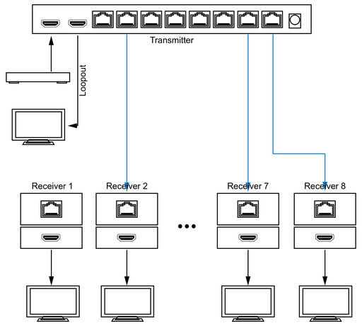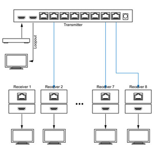 - Includes one HDMI transmitter and 8 receivers.