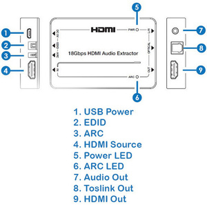 - Support extracting audio from HDMI source device to multichannel optical fiber (SPDIF) and L/R analog audio output.