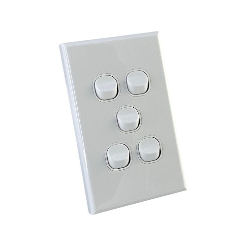 A classic style high quality vertical 16A Five Gang Wall plate with switch to turn power or lights on or off for your home or office. Excellent build quality. White in colour.