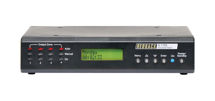 The A 1709 is a versatile timer which has four switched 24V DC outputs and four closing contacts which activate simultaneously. It permits a total of 50 station (event) switching times. Each can be set to turn on any single day of the week or on multiple days, from 1 sec up to 24 hours. Switching events programmed for multiple days count as only a single station (event) and each of the 50 event times may be set to any (but not multiple) output.