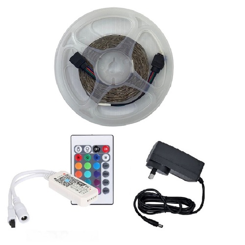 Red, Green and Blue IP65 Waterproof LED Strip Light kit comes with a 5 metre 2835 SMD LED strip with 300 LEDs, 12V DC Power Supply Adpater and a wifi and infra-red LED controller.