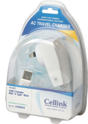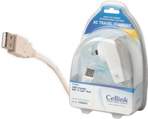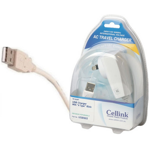 This 5V DC 1A Wall Charger has a hard wired cable with a USB A Plug for charging USB devices with a USB A socket.