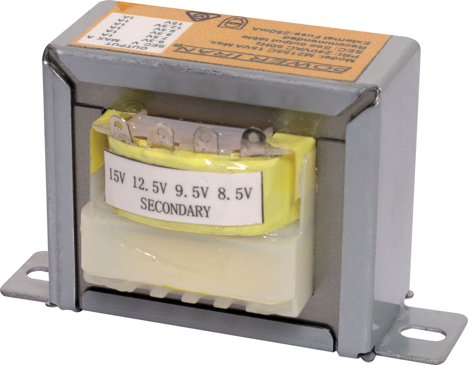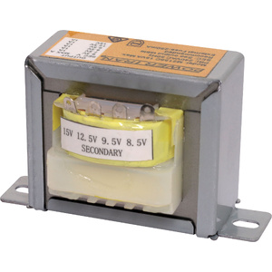 EI-Core 240V AC mains transformer with 1A multi tapped secondary configuration. 0V, 6.3V, 7.5V, 8.5V, 9.5V, 12.5V and 15V secondaries are available at 1A current output. Primary is fitted with 200mm fly leads. Secondary taps have solder tags. Fully electrical authority approved for AS/NZS 61558.2.6.