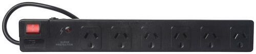 6-way powerboard with an illuminated master switch, 10A resettable fuse button, single MOV spike arrestor, and a 1-metre cord with a right-angled plug.