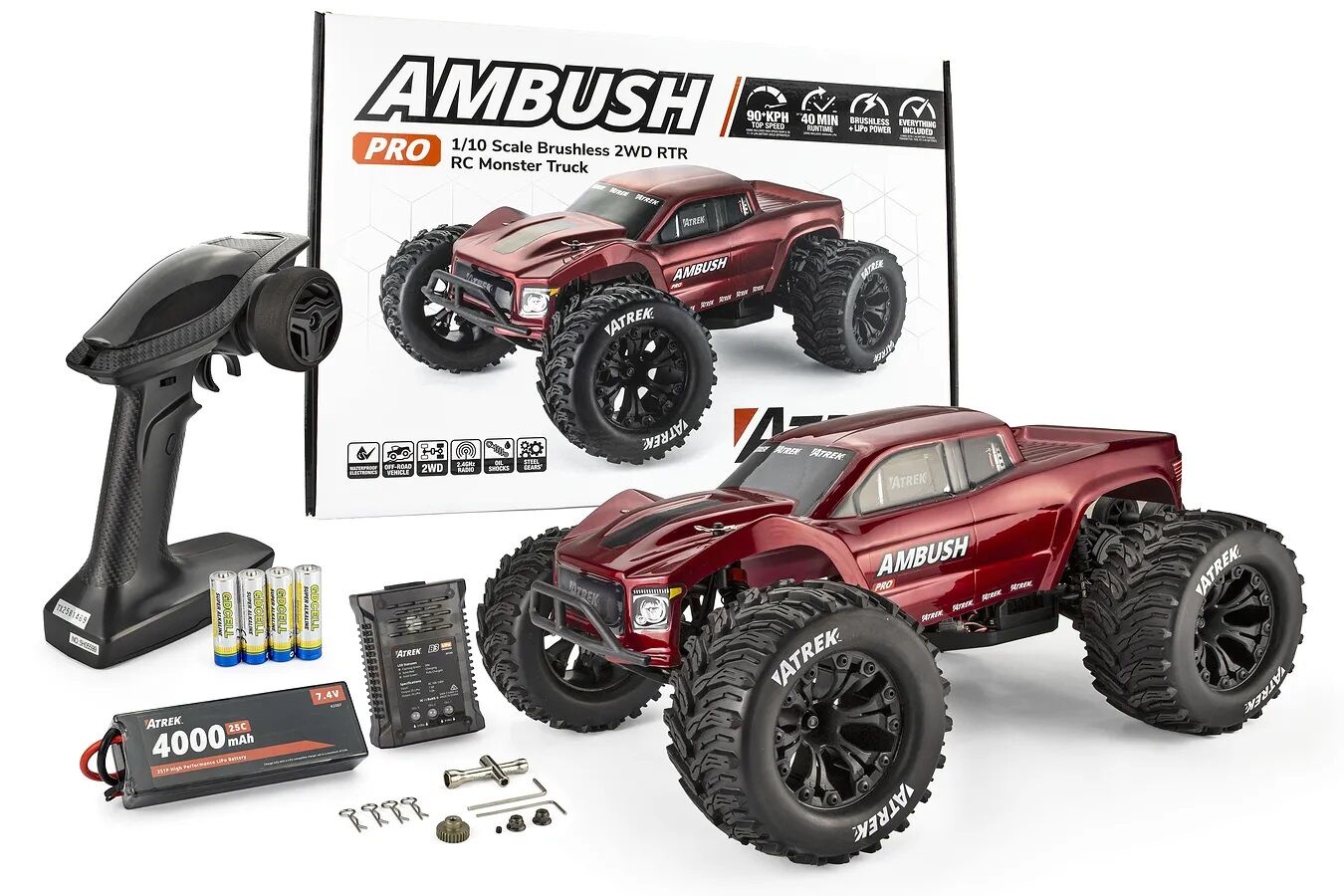 Introducing the Atrek Ambush Pro RC Monster Truck, the ultimate monster truck for high-speed, wheelie-popping fun. This RC Monster truck is a true Ready-to-Run (RTR) truck designed for a hassle-free and complete out-of-the-box experience. The Ambush includes everything you need to start racing ASAP, with a high-capacity 4000mAh 2S (7.4V) LiPo battery, fast charger and even AA batteries for the controller, this RC Monster Truck is ready when you are. Just charge and GO!