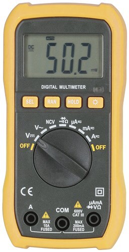 This practical multimeter measures both DC and AC voltages and currents. The default autoranging setting automatically selects the best range for your measurements. If a different range is preferred, simply switch it to manual. A built-in buzzer and LED warning light alert you to low resistance, detected voltage and live wires. In low light conditions you can activate the 10 second backlight to view measurements. Use the data hold button to lock them on screen for data capture and analysis.