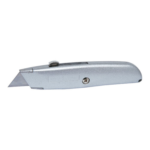This handy box cutter uses standard utility knife blades. Zinc alloy Metal body. Retractable blade locks