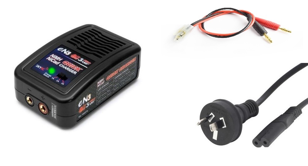 3A Fast RC Battery Pack charger for charging your 4 - 8 Cell Ni-mh and Ni-Cad RC battery packs with Tamiya Connector. Comes with a figure 8 240V AC Mains cable.