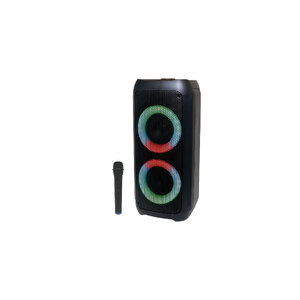 This wireless Bluetooth party speaker has been designed for outdoor or indoor entertaining with colour LED lighting for added party atmosphere. Powered by an internal rechargeable battery, it’s the perfect speaker to set up anywhere you need instant sound, providing up to 8 hours use before requiring charge (mains charger included - this can also be left connected if using at home). The unit is True Wireless Stereo (TWS) enabled allowing you to synchronise two speaker units together for stereo sound in a large room or outdoor area. Stream audio wirelessly from any Bluetooth enabled device, or play audio from the USB port or micro SD card slot. With the included wireless microphone it turns into a mini PA system allowing you to easily make speeches or perform your own home karaoke along with the music. Music and microphone audio can also be recorded to connected USB memory sticks. Dimensions: 560H x 250D x 260W.
