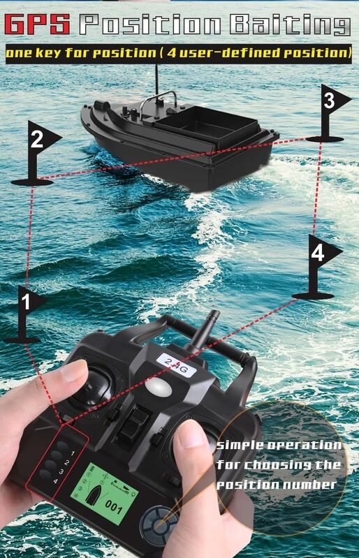 The auto-return function ensures your boat comes back to you at the press of a button, providing peace of mind and saving precious fishing time.Our advanced remote control features an LCD screen that displays vital information such as boat's battery level and preset locations, empowering you with real-time insights for optimal performance.