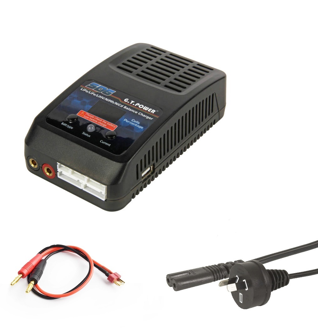 The GT-Power SD6 is a compact intelligent 2 to 6cell battery pack Li-Po (Lithium Polymer), Li-Fe (Lithium Ion), Li-Hv, Ni-MH and Ni-Cad balance charger will charge your RC Drones, Trucks, Boat, Plane, etc rechargeable batteries. With a 6A charge rate and intelligent design, it will charge your battery pack safer and quicker than the standard charger provided in RTR RC products. It even has an LED display charge indicator on the front panel. 240V rated, it comes with a figure 8 IEC C7 cable for mains connection.