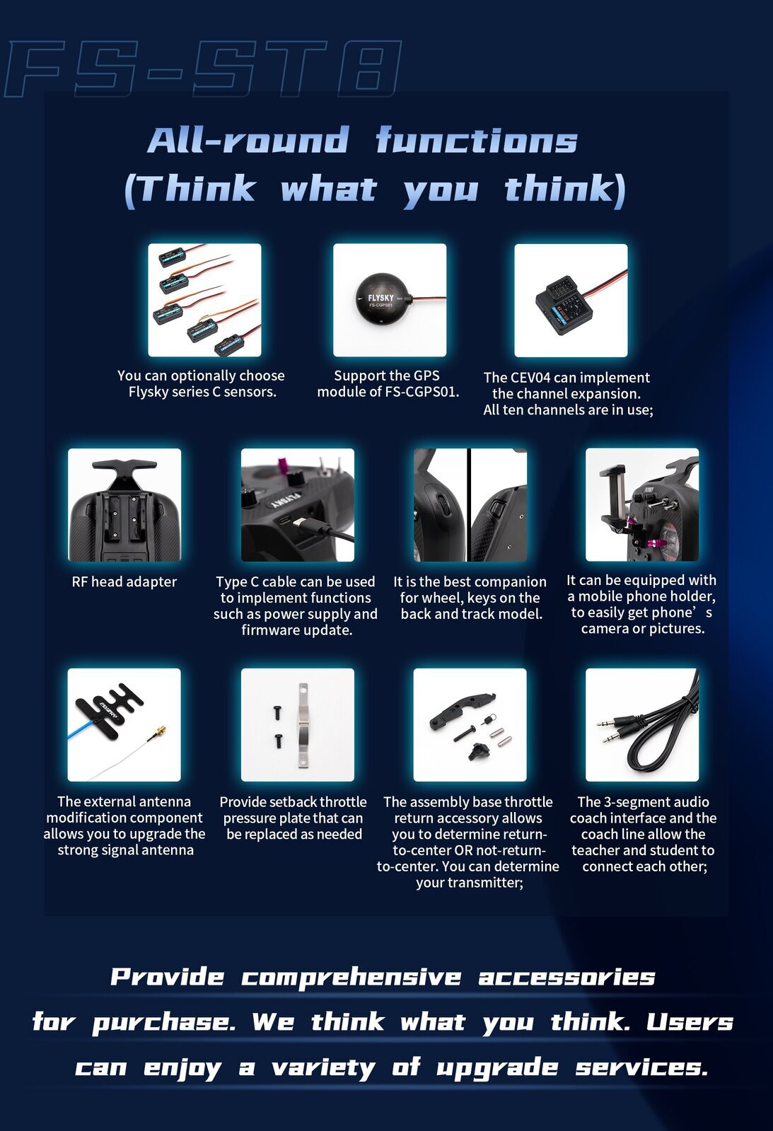 - Back transmission of RSSI, BVD voltage, other temetry information Support fixed-wing, delta-wing, glider, helicopter, multi-axis, FPV, car model, engineering vehicle, robot, boat and other models.