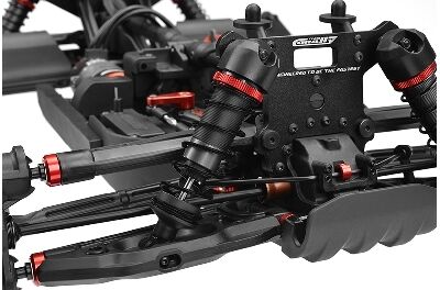 At the core of this drivetrain are CNC bevel gears, a vibrant red anodized aluminum central diff case, and robust spring steel outdrives – a symphony meticulously orchestrated for unyielding power and longevity. And in the world of monster trucks with oversized tires and wheels, the features of this robust drivetrain are magnified even more!
