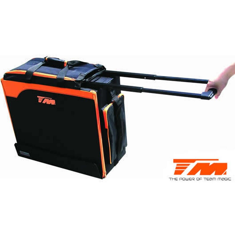 Not long ago, racers used to carry many small bags to race. Racers were also forced to put everything together, no matter it is clean or dirty. To solve these problems, TM has tried many bags from other industries. These sample bags were made for different purposes. This gives us a good idea: We need to build a bag for RC purposes. Therefore, you can find TM touring car bag has many special features. Different items can be packed in different places, but you still have only one bag to take care. Team Magic is the first company releasing a true RC car bag. The bag has particular space for car, tools, setup board & connecting other bags. In addition, it is also very easy to tow the bag around the track as a cool handle & smooth trolley wheels are used.