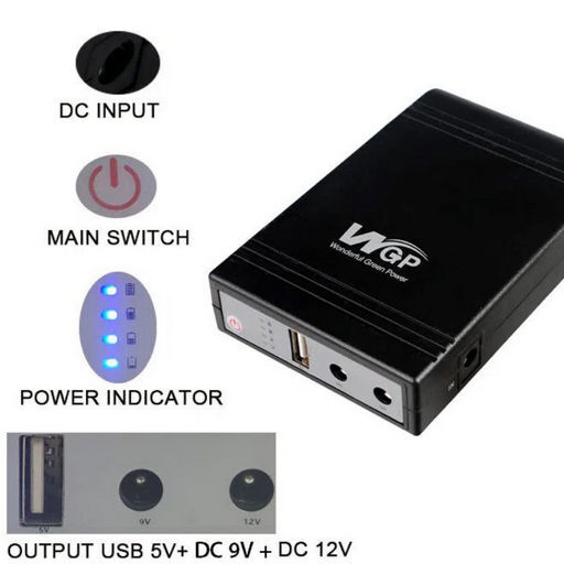Power bank mini UPS has multiple outputs including USB 5V, DC 9V and DC 12V outputs. It can run 3 different devices at the same time. Use with WiFi router, telecom network device and charging smartphone, etc.