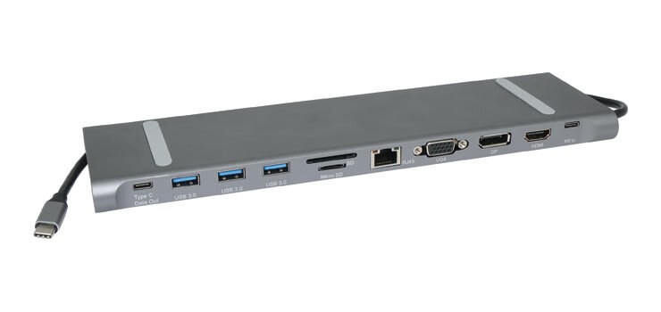 A handy laptop docking station hub for USB C type equipped laptops. A must have for anyone using their work laptop with a monitor at home or for families with a single desk for multiple laptops. Connects to USB type C devices and provides connection for external peripherals via 3 x USB 3.0 ports, 1 x USB C 3.0 data port, SD card slot, Micro SD card slot, 3.5mm mic/headphone jacks, gigabit wired ethernet port and external monitor connection via VGA, HDMI or DisplayPort. Maximum 4K @ 30Hz. Passes through 60W power delivery via USB C for keeping your laptop charged while you work. Size: 275 x 76 x 17mm.