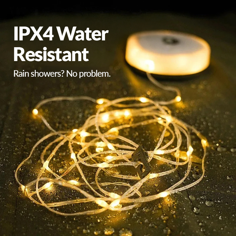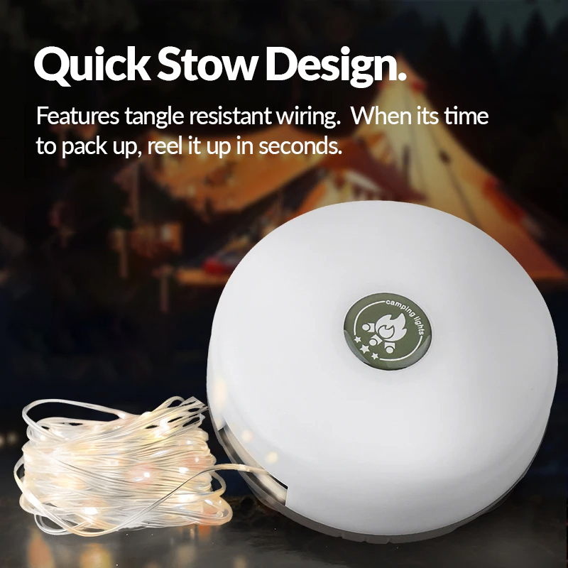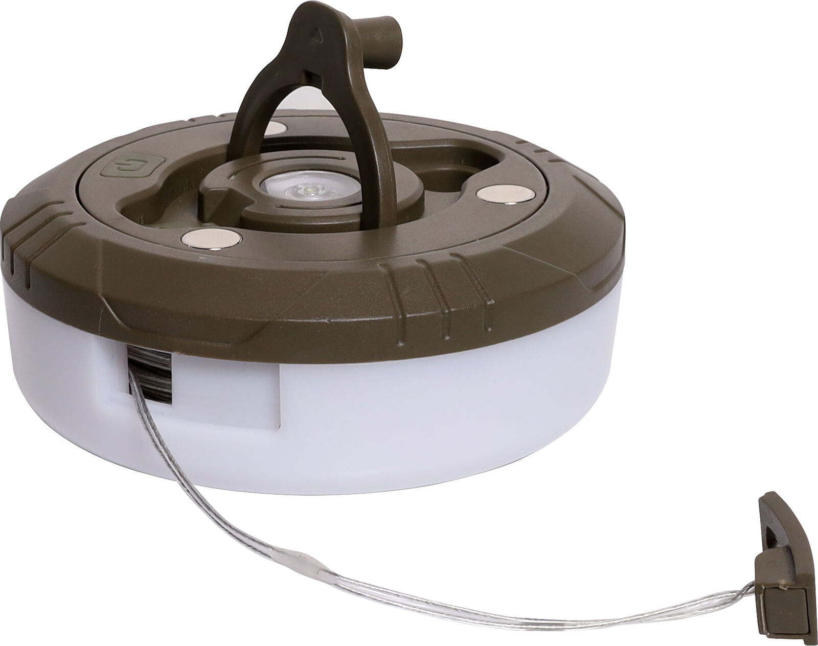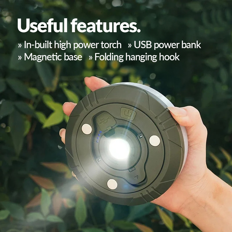 Light up your adventures with this all-in-one USB rechargeable camping string light! Works 3 ways, string out the RGB LEDs for decorating your space, reel it in for a handy mini lantern light or use the torch in the base to light your way. This compact and versatile lighting solution sets up quickly and is perfect for camping, parties, holiday decorations and entertaining. It has several key features including 6 different lighting modes to set the mood, a USB power bank function to charge your phone, and a magnetic base with hook so you can place it just about anywhere!