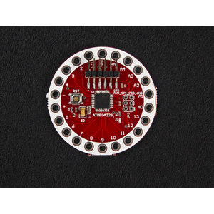This Lilypad wearable development Board is an Arduino-programmed microcontroller designed to be easily integrated into e-textiles and wearable projects. It offers the same functionality you find in other Arduino boards, in a lightweight, round package designed to minimize snagging and profile, with wide tabs that can be sewn down and connected with conductive thread.